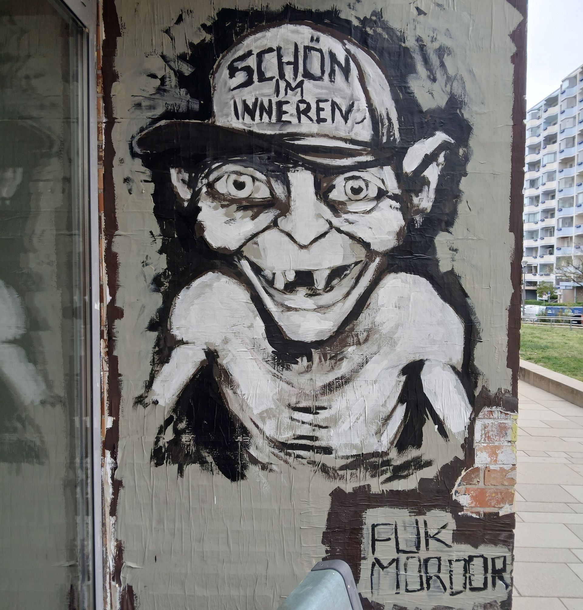Die Lebensleistung der damals Erwachsenen zählte plötzlich nicht mehr. Zur Arbeitslosigkeit gesellte sich vielfach auch Orientierungs- und Hoffnungslosigkeit. Die Jugendlichen der Wendezeit suchten Bestätigung, Gemeinschaft, Kompensation und vor allem Identität. Subkulturen wie Techno, Punk, Hip Hop oder auch „rechts sein“ wurden erforscht. Die aus dem Westen herüber geschwappte Graffiti-Kultur entwickelte sich zu einem Anker für entwurzelte Jugendliche. In den Plattenbausiedlungen von Neu- Hohenschönhausen und Marzahn-Hellersdorf wurde Graffiti für viele Jugendliche zu einem Medium der Selbstdarstellung und Selbstbehauptung. Motto: ICH BIN DA! Abgrenzung, Rebellion, Aufmerksamkeit, Ausdruck. Die Herangehensweisen waren vielfältig. Letztlich kamen aus den Plattenbausiedlungen etliche Graffiti-Künster*innen, die auf Grund der Qualität und Quantität ihrer Arbeiten überregional an Einfluss gewonnen hatten.