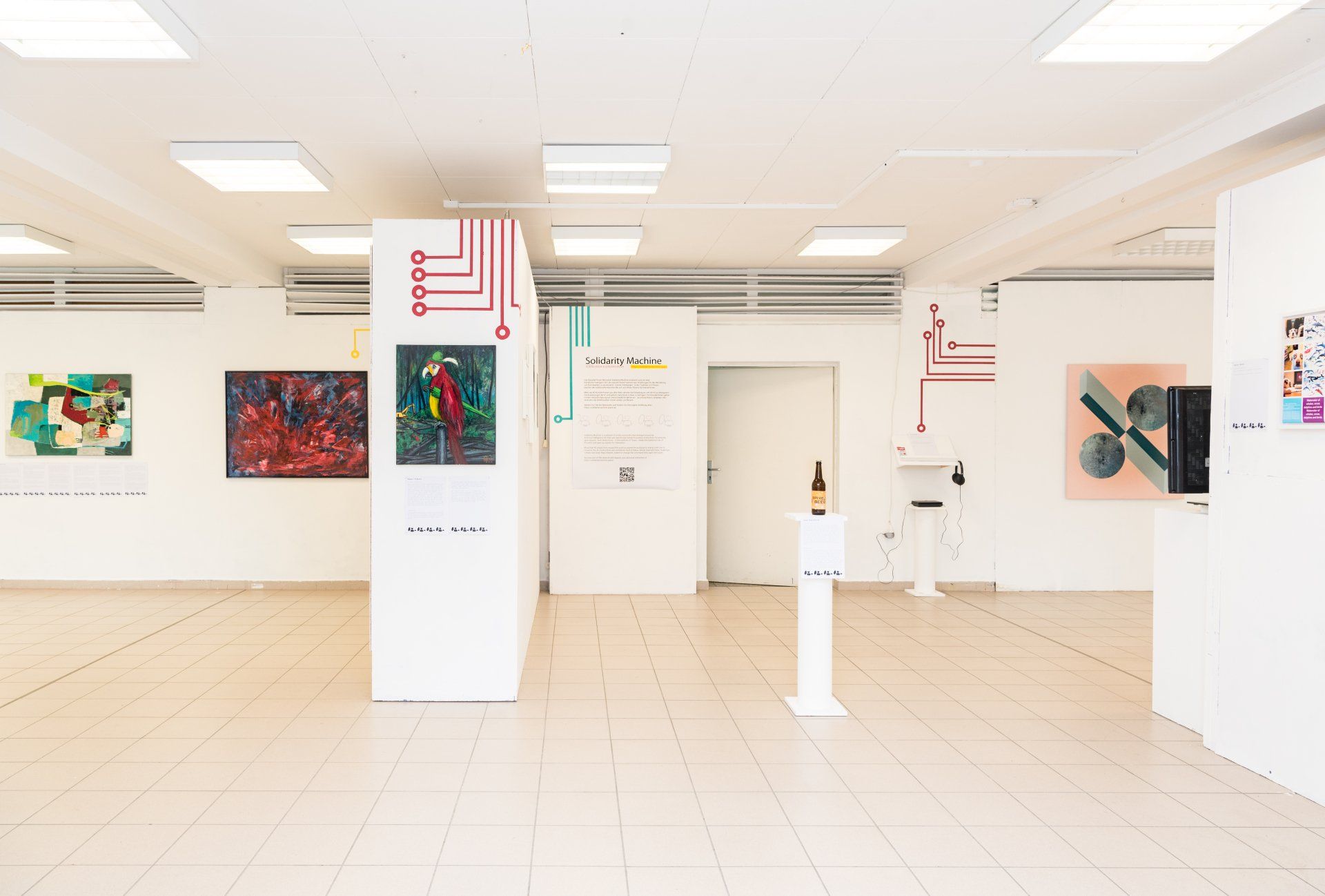 Die namensgebende Maschine hilft uns die Befriedigung wiederzuentdecken, die wir erleben, wenn wir gleichzeitig mit anderen gestalten - trotz physischer Distanz. Der Algorithmus, welcher der Solidarity Machine zugrunde liegt, wurde auf der Grundlage eines Archivs mit künstlerischen Anleitungen trainiert und erzeugt, neue, originelle Anleitungen für den Umgang mit den Krisen unserer Zeit. “Solidariy Machine” dient als Ort, um Ideen zu testen und unbekannte Gebiete zu kartieren. Der immaterielle Algorithmus trifft auf einen sehr realen Schauplatz, der es den Teilnehmern ermöglicht, ihre Kunstwerke auszustellen. Alle Werke, die mit Hilfe der KI entstanden sind, können sich für die Gruppenausstellung in der Projektraum Galerie M qualifizieren. Es gibt kein Auswahlverfahren und keine Kuratierung.