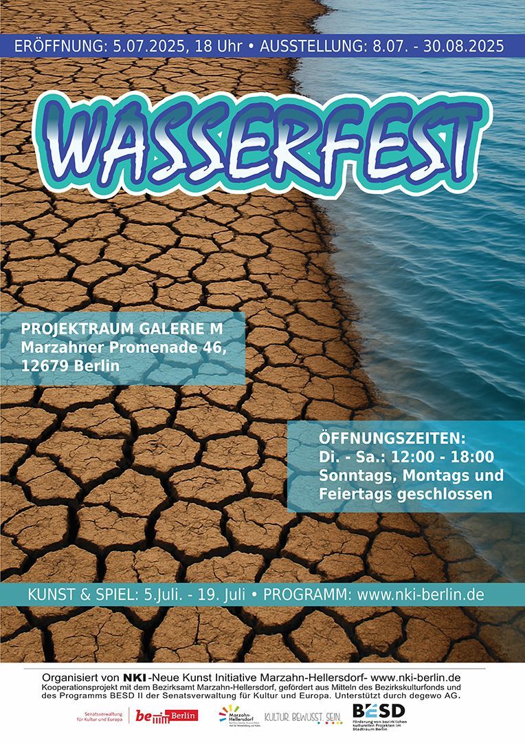 Die Gruppenausstellung “WasserFest” im Projektraum Galerie M setzt sich durch eine Vielzahl an Medien und künstlerischen Perspektiven mit der Rolle von Wasser in seinen Erscheinungsformen auseinander, sowohl auf physischer als auch auf metaphorischer Ebene. Wasser ist überall auf der Erde zu finden, von riesigen Ozeanen bis hin zu den Wolken. Diese klare, geschmacklose und geruchlose Flüssigkeit ist für alle Lebensformen entscheidend. Seine Fähigkeit, viele Substanzen zu lösen, macht es zu einem unverzichtbaren Bestandteil der Natur und des Lebens. Die Erwärmung der Erde führt zu veränderten Niederschlagsmustern und häufigeren Dürren. Der Anstieg des Meeresspiegels bedroht zudem küstennah gelegene Wasservorkommen und verursacht die Versalzung von Grundwasserquellen. Klimawandel, Wasserknappheit,