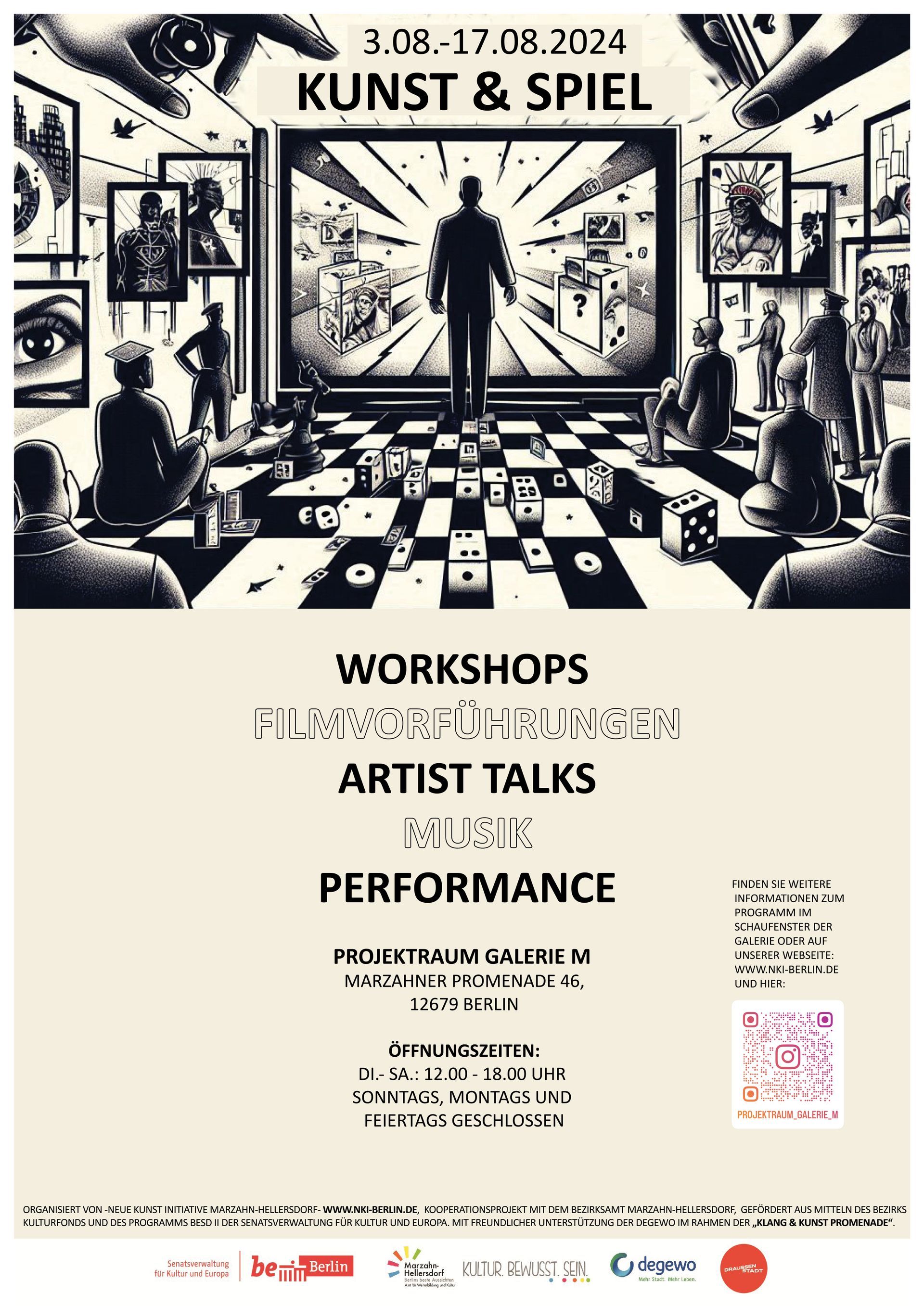 Kunst und Spiel ist ein interaktives Projekt, das vom 3.08. bis 17.08. in der Galerie und auf der Marzahner Promenade stattfand. Es bestand aus einer Reihe von Workshops, Performances, Aktionen, Musik, Künstlergesprächen und Videoprojektionen.